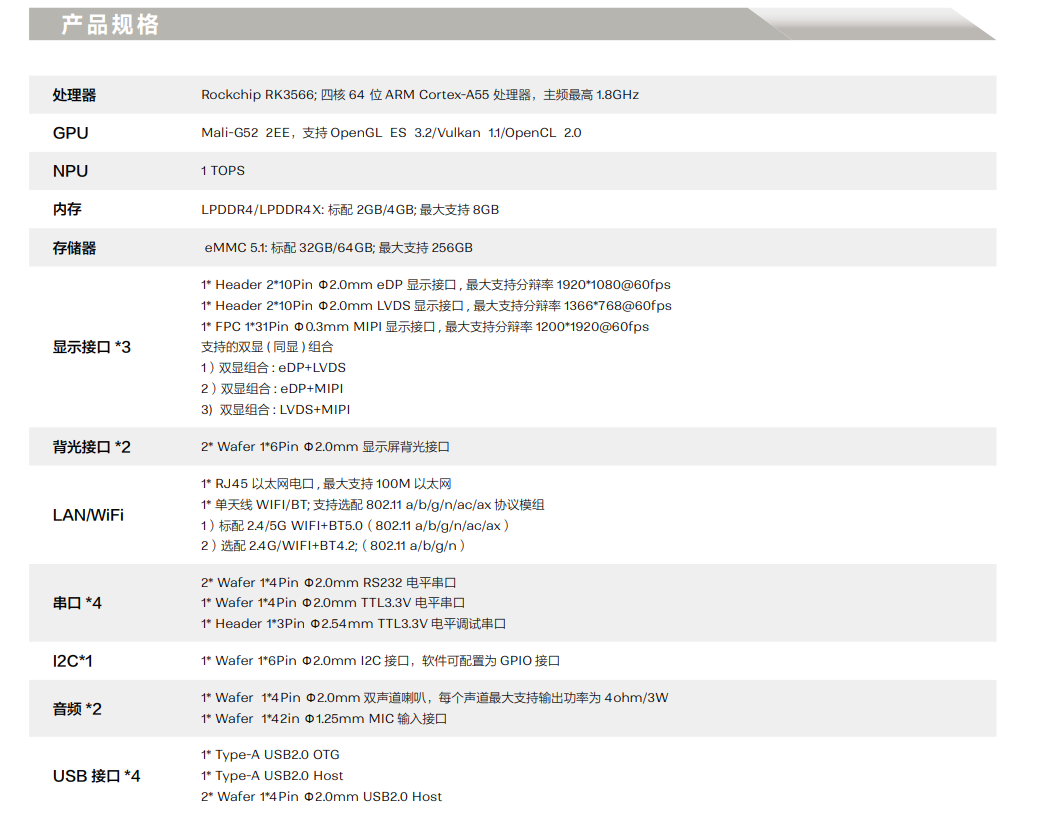 • 采用瑞芯微RK3566 四核64 位Cortex-A55 处理器, 主频最高1.8GHz,效能有大幅提升;采用22nm先进工艺,具有低功耗高性能的特点